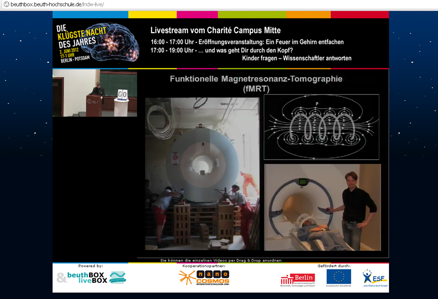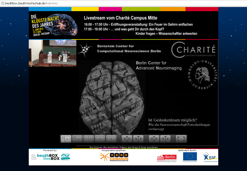nanocosmos zeigt auf der Langen Nacht der Wissenschaften in Berlin Live Video Streams in Full-HD vom Ausstellungsbereiches der Beuth-Hochschule Berlin sowie der Eröffnungsveranstaltung aus der Charite.