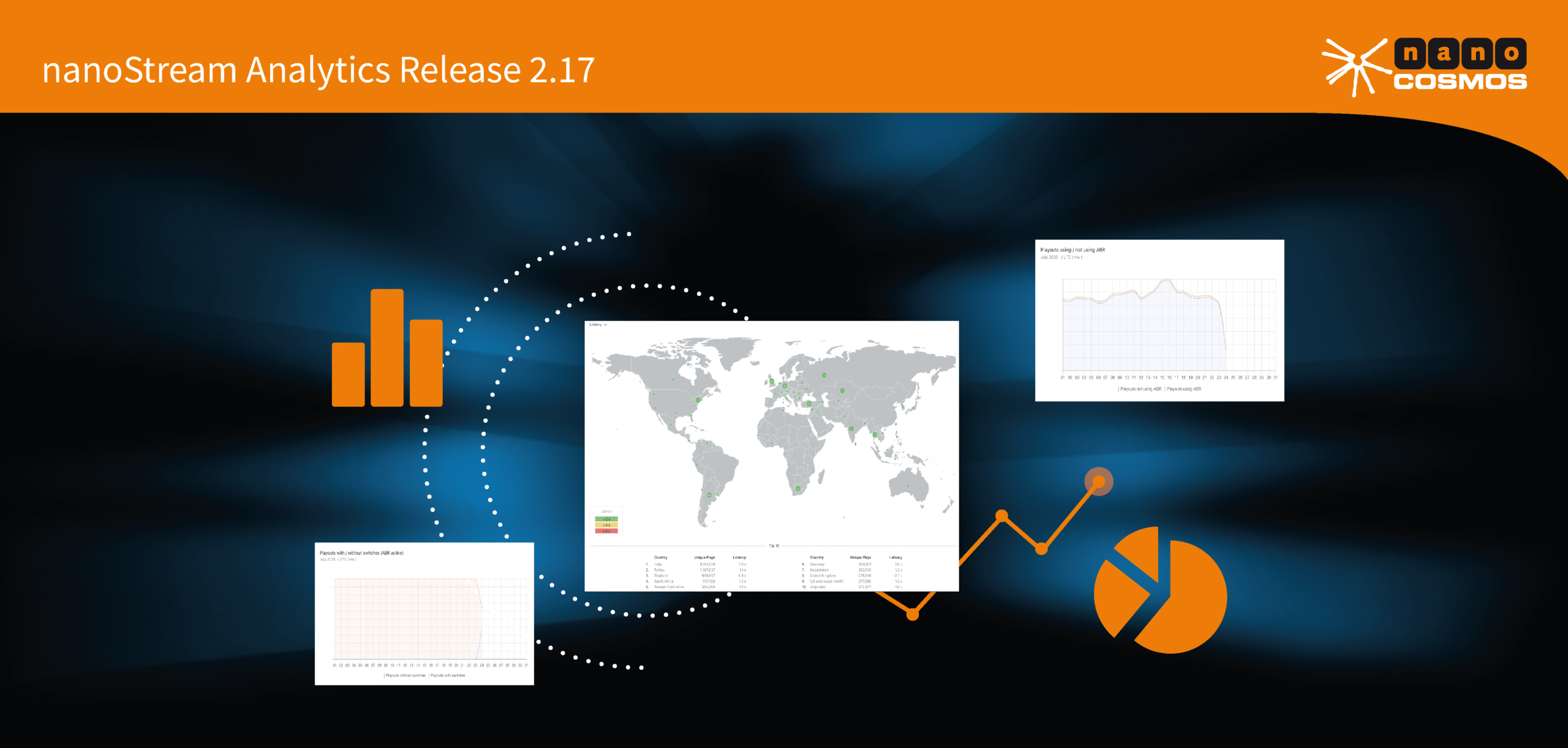 We have released nanoStream Analytics 2.17. The new release introduces a new feature that is available for multiple widgets and grants access to additional breakdowns. With one click customers can retrieve more detailed data on the different displayed information: Part of these widgets are e.g. about usage, playout/ingest and maximum concurrent viewers. The newly added breakdowns pop up to display the following top ten measures for the selected parameters: IP, stream name, country or e.g. city. Another widget is the world map that shows usage as part of a geographical breakdown. It now can be set to show ranking countries for e.g. playout/ingest, buffering play ratio, latency, playtime average, usage, ABR playtime, ABR viewer, abr switches, quality of experience. The newly added breakdowns enable stream providers to better understand changes of latency, playing time or e.g. stream quality, fluctuations and their cause based on respective parameters. Further details can be found in the nanoStream Analytics documentation and nanoStrem Analytics Zoom Feature documentation.