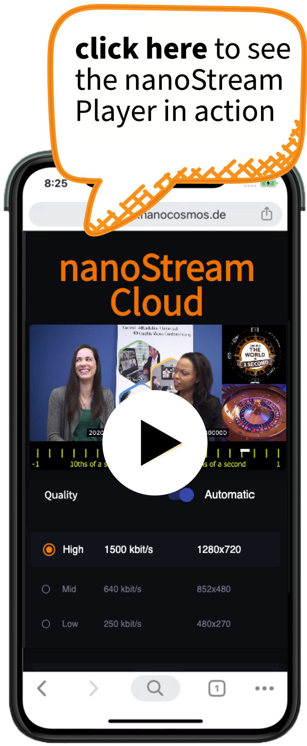 Engage your audience with ultra-low latency live streaming! Start our nanoStream Player here to experience Adaptive Bitrate (ABR) Playback and Live Transcoding: Interactive live streaming on browsers on all devices, suitable for all bandwidths and network connections.